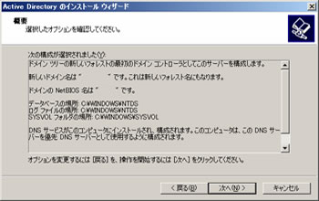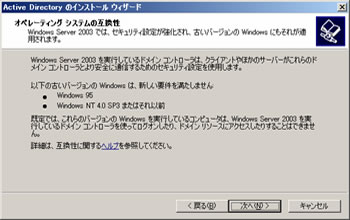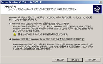 今回はWindows Server 2003だけでサーバーを構成するため Windows 2000またはWindows Server 2003との互換性を選択し 「次へ」 を押下