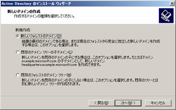 - [新しいドメインの作成] では、新しいフォレストにドメインを作成するか、すでに作成しているドメイン ツリーの子ドメインとして作成するか