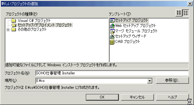 - プロジェクトの種類ペイン(左)の [セットアップ/デプロイメント プロジェクト] を選択しテンプレート ペイン(右)の [セットアップ プロジェクト] を選択