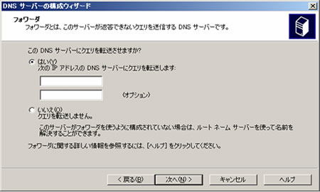 - 上位サーバーがある場合「はい」にチェックをつけフォワーダサーバーのIPアドレスをを入力し「次へ」を押下
